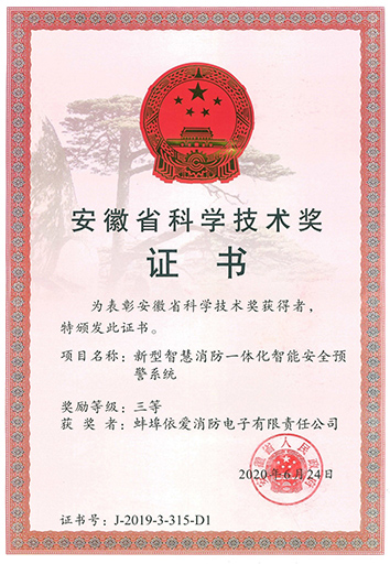 2020年629日上午,安徽省科學(xué)技術(shù)獎(jiǎng)勵(lì)大會(huì)在合肥隆重召開(kāi)。由依愛(ài)消防研制的“新型智慧消防一體化智能安全預(yù)警系統(tǒng)”項(xiàng)目獲得安徽省科技進(jìn)步三等獎(jiǎng)。