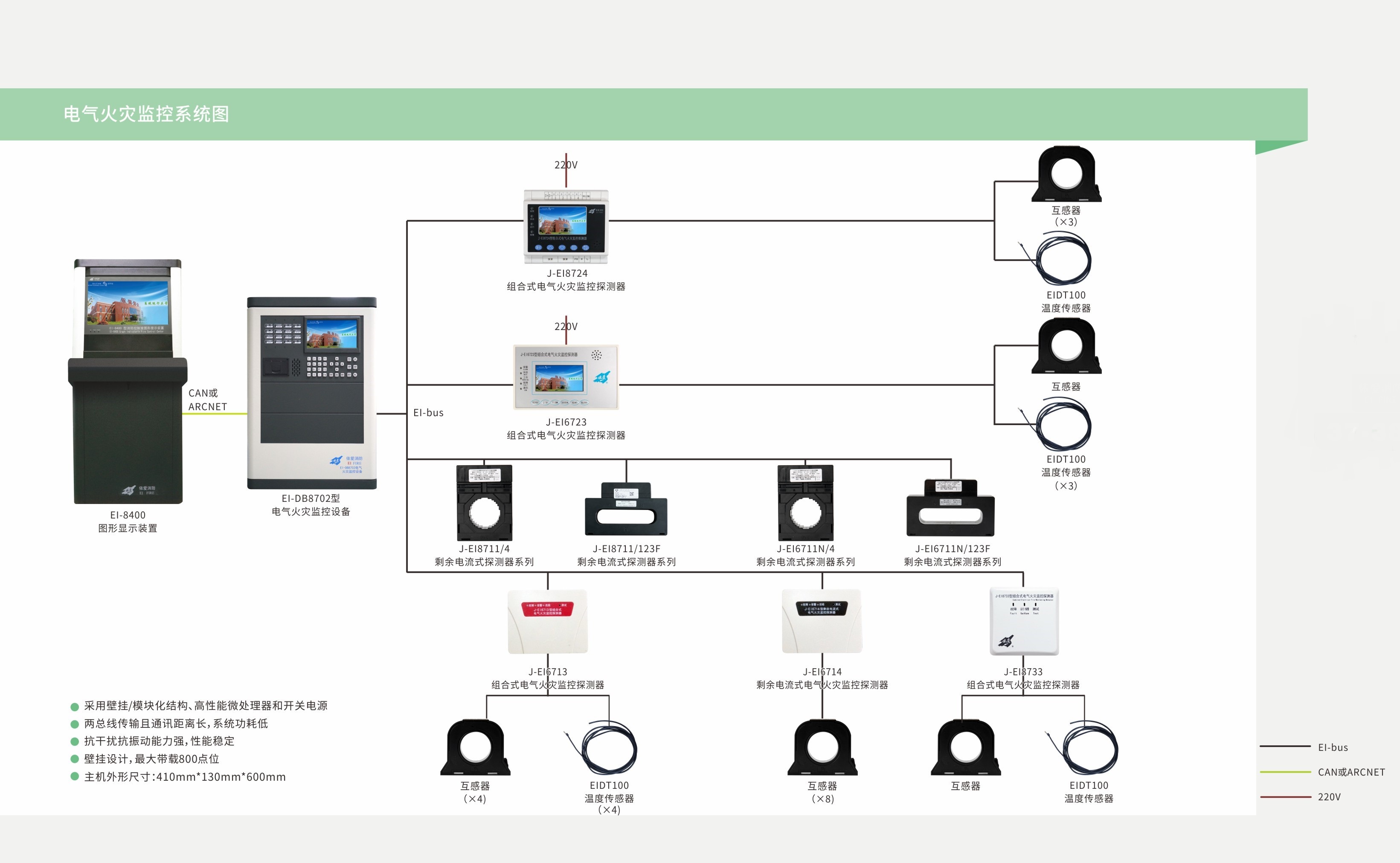 EI 系列電氣火災(zāi)監(jiān)控系統(tǒng)應(yīng)包括電氣火災(zāi)監(jiān)控設(shè)備、剩余電流探測(cè)器(電流互感器)、測(cè)溫式探測(cè)器(傳感器)等產(chǎn)品。